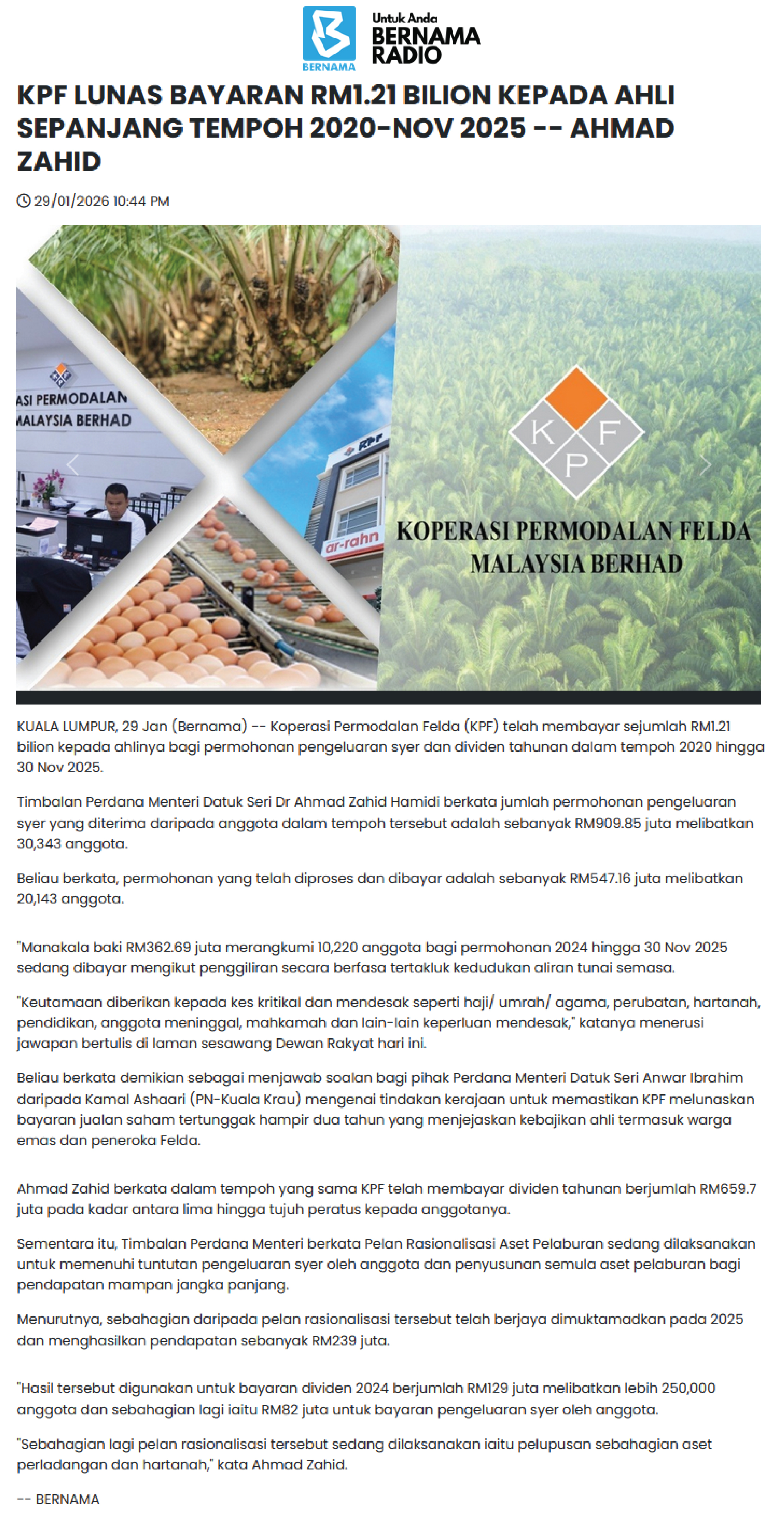 KPF LUNAS BAYARAN RM1.21 BILION KEPADA AHLI SEPANJANG TEMPOH 2020-NOV 2025 - AHMAD ZAHID